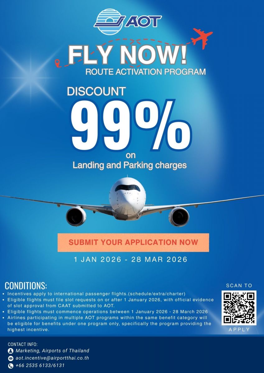 泰國機場管理局(Airports of Thailand Plc.,AOT)為響應政府刺激旅遊業的政策,隆重推出「即刻啟航!航線啟用計畫」(FLY NOW! ROUTE ACTIVATION PROGRAM)。此計畫旨在鼓勵航空公司開闢新航線或增加現有國際航班頻次,以促進泰國航空交通量及旅遊經濟發展。